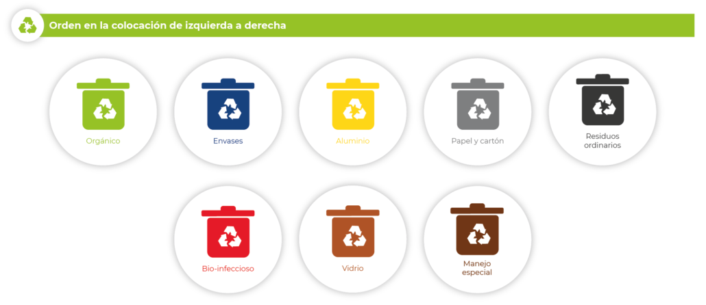 Estos criterios de separación por colores se ve en la siguiente figura. El orden en la colocación se hace de acuerdo con las flechas, las cuales son la posición de cada recipiente en el orden de izquierda a derecha.