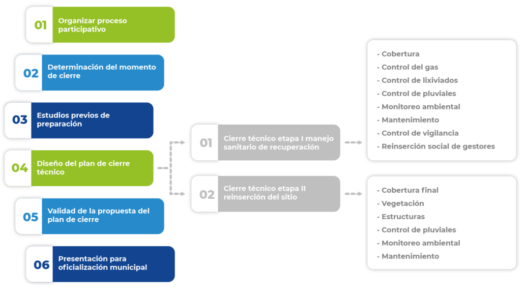 El procedimiento para el cierre técnico de un relleno sanitario o de un vertedero sigue un proceso cuyos pasos se muestran a continuación. En cada link se puede obtener mayor detalle.