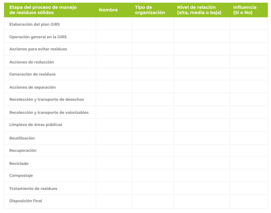 En el proyecto CYMA (2007) se recomienda que además de conocer las organizaciones, instituciones, empresas y personas vinculadas a la gestión de residuos sólidos, es necesario conocer aspectos de sus intereses y entorno, con el fin de valorar con mayores elementos de juicio cuáles actores sociales podrían participar en las diferentes fases del proceso de planificación y gestión. Los aspectos recomendados por conocer son: